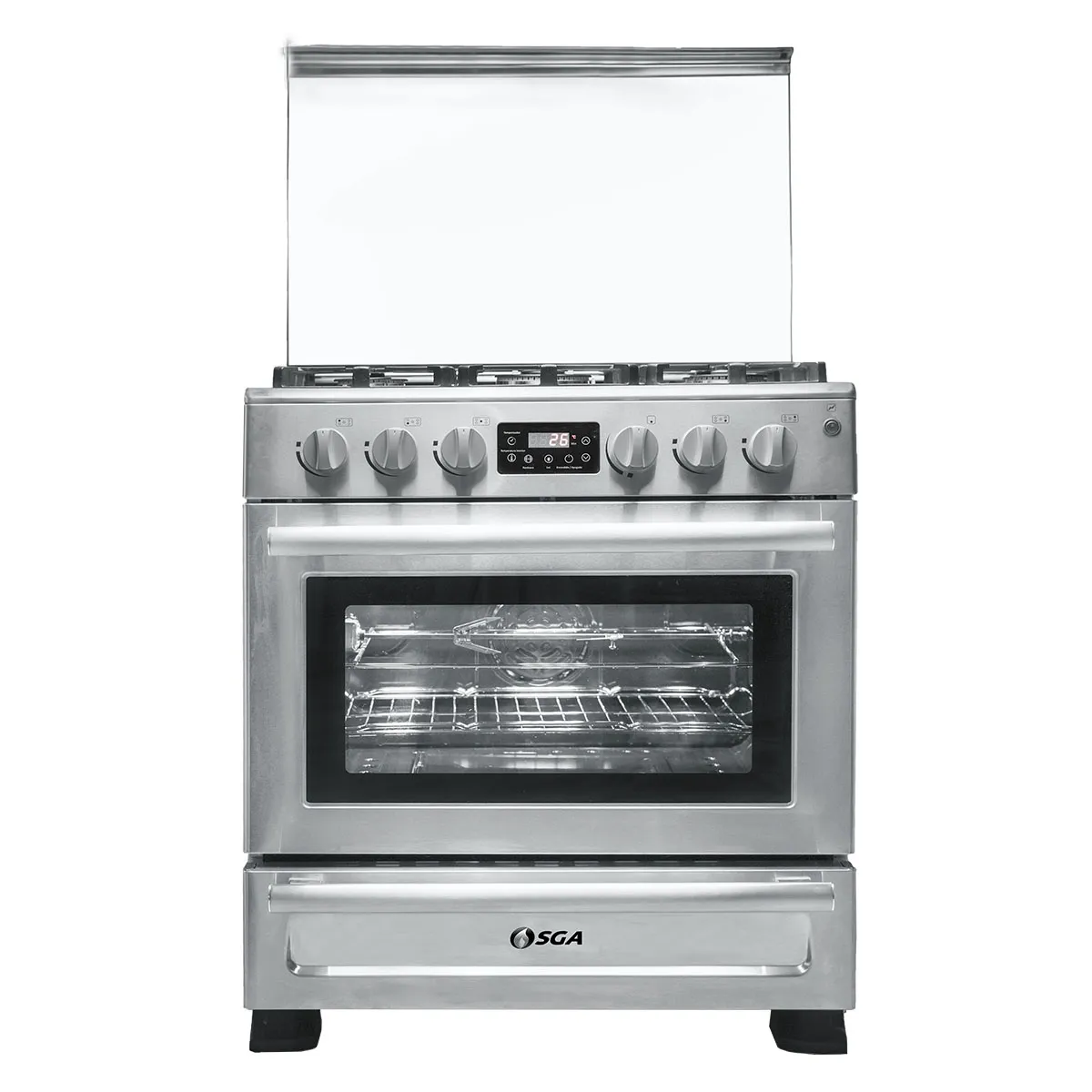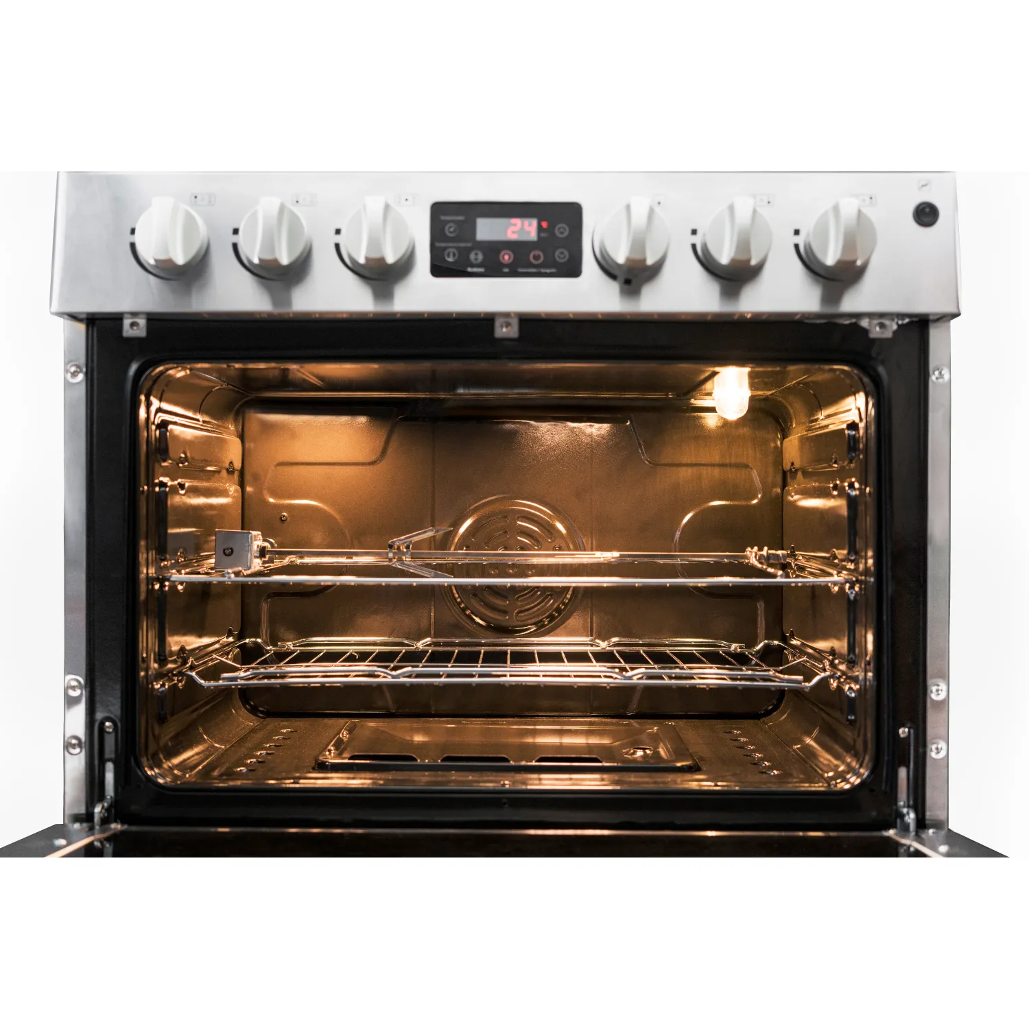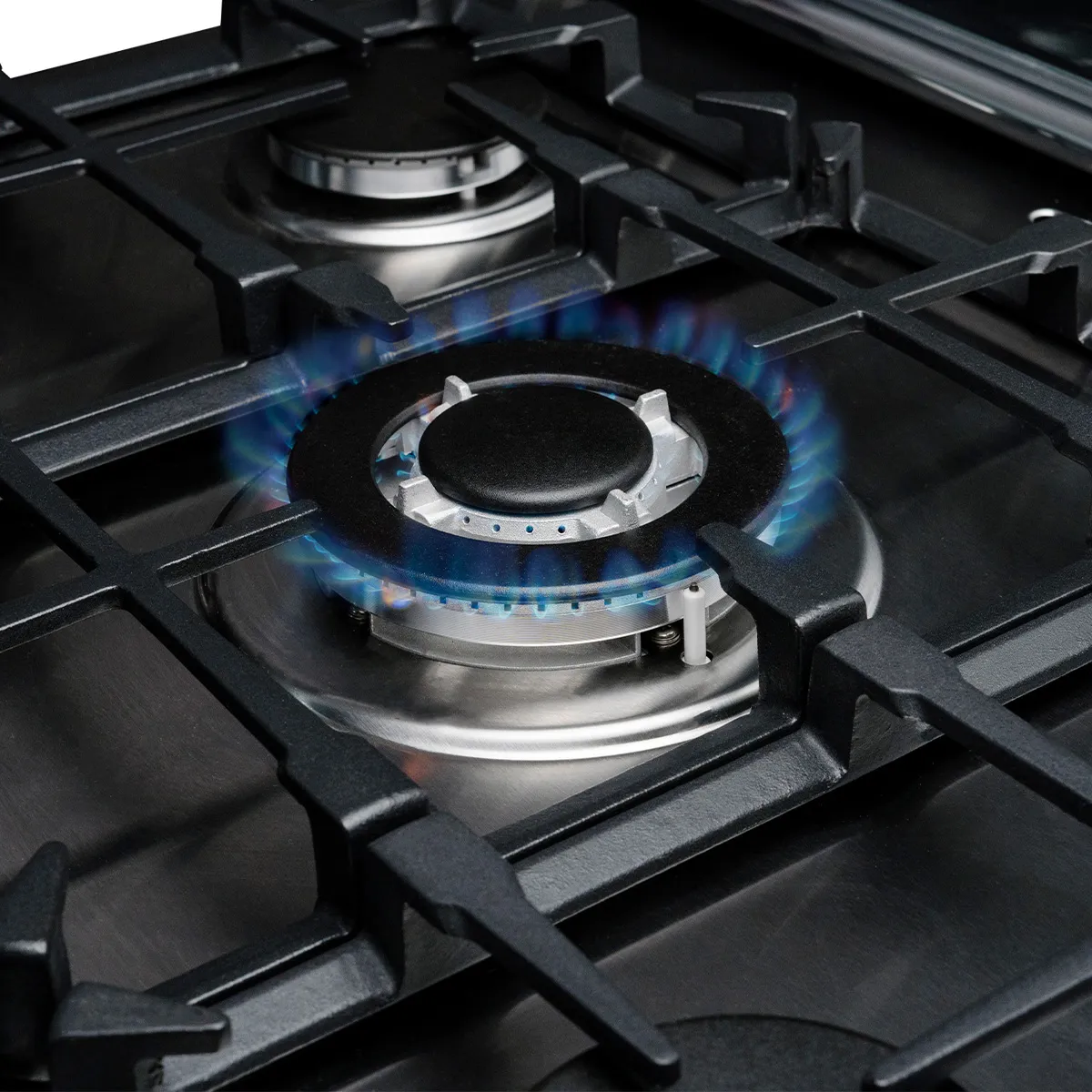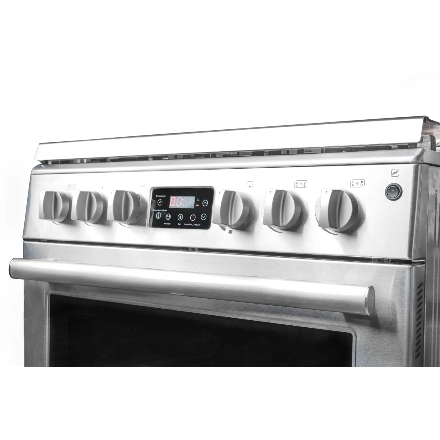 Cocina Línea Platinum de 30” Digital de 5 hornillas con un quemador central de corona doble, calentador de platos, encendido eléctrico y panel digital. 100% acero. Horno con puerta de acero con luna visora.