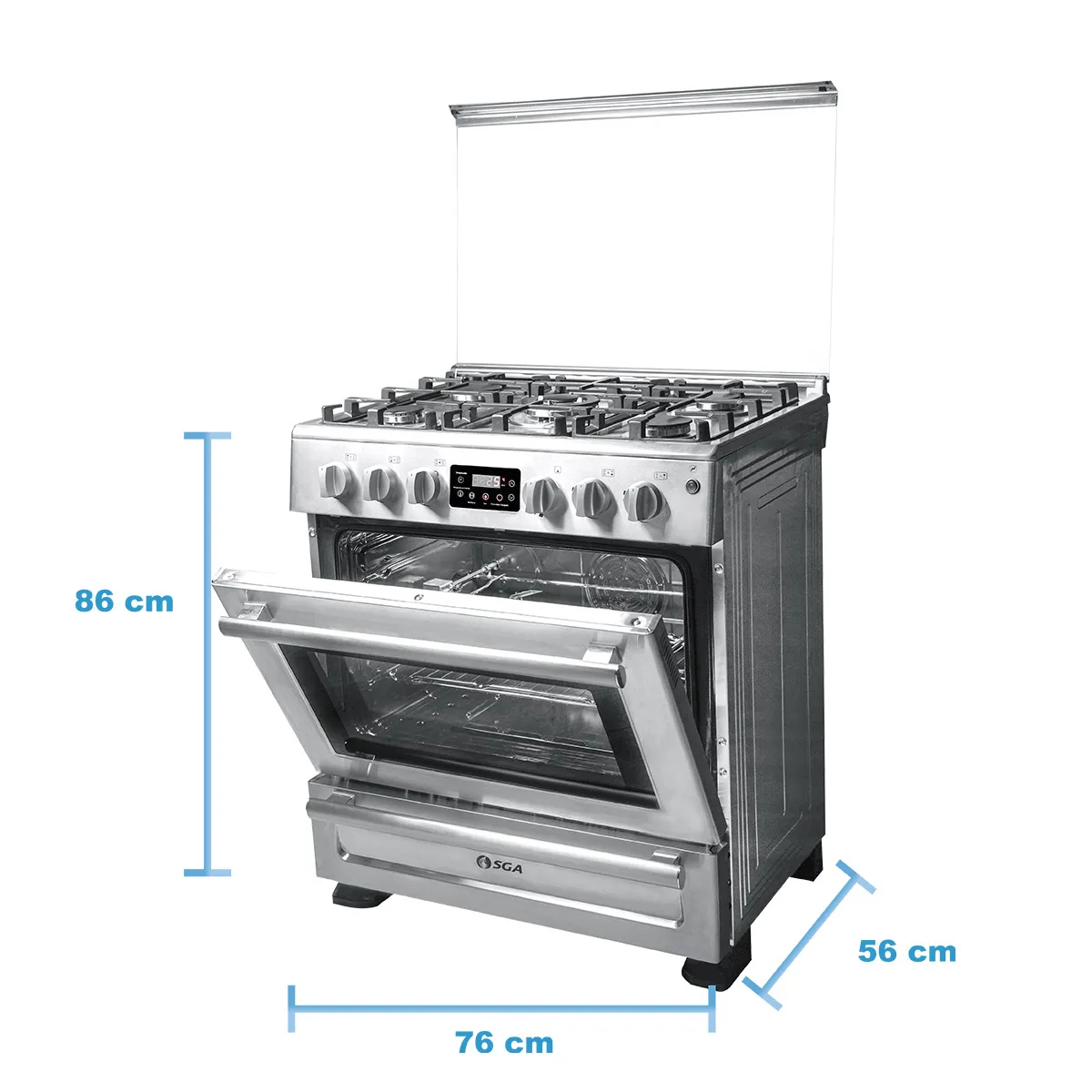 – 100% de Acero. – Panel Digital. – Tapa de vidrio. – Puerta del horno de acero con luna visora. – 5 quemadores de gas (con 1 quemador central de corona doble). – Perillas y tirador de horno en color acero. – Rejillas superiores de fierro fundido. – Luz en el horno. – Incluye rosticero dentro del horno. – Encendido eléctrico para los quemadores de mesa y el horno. |